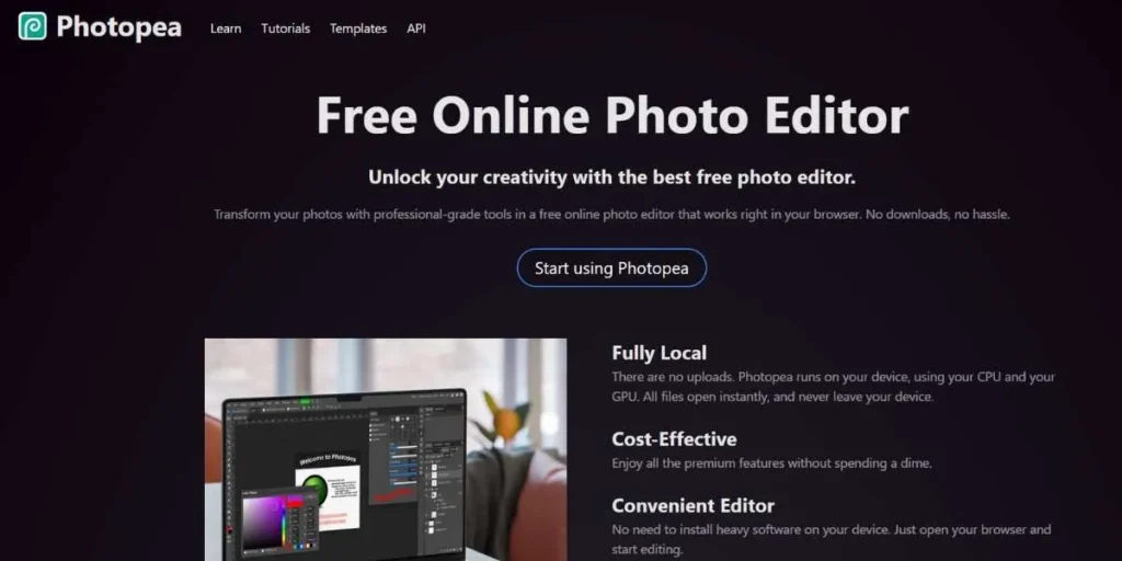 Photopea is a very amazing web-based editor that is very similar to the interface and functionality of Photoshop. It is fully web-based, supports PSD files, and has advanced capabilities, including layers and masks, and does not need to be installed. Files remain on your machine to stay private, which is ideal for editing on any computer or when you cannot install software, making it one of the top free Photoshop alternatives available online.