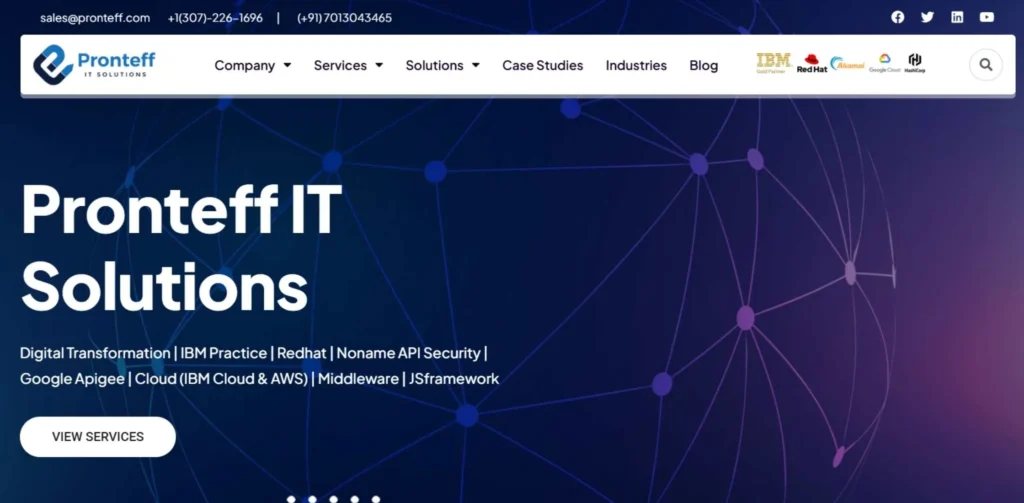 Pronteff IT Solutions is an IT system integrator based among the leading software companies in Madhapur Hyderabad, focusing on end-to-end integration and automation services. The company has 8+ years of experience as an IBM Gold Business Partner and provides a full range of services in API software development, platform implementation, and managed service offerings. Pronteff serves the BFSI, Media, and Pharma industries, operating globally with a team of 120 integration specialists, and is certified with ISO 9001:2018 and ISO 27001:2022.